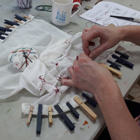 Prepare and dye fabric samples in an indigo dye vat, using varied tying, stiching and folding techniques to make attractive patterns, including Japanese shibori. You will be assisted with designing your own combination of patterns on a tote bag, scarf or piece of fabric be used in another project. You take home both the sample pieces and the item you dyed.